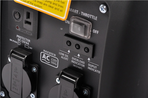 伊藤動力的汽油發(fā)電機控制面板右側(cè)有三個指示燈,從左向右依次為機油報警燈、過載保護燈、正常運轉(zhuǎn)指示燈;節(jié)能開關(guān)也在右上角,ON表示轉(zhuǎn)速在500W以下;OFF表示轉(zhuǎn)速在500W以上。